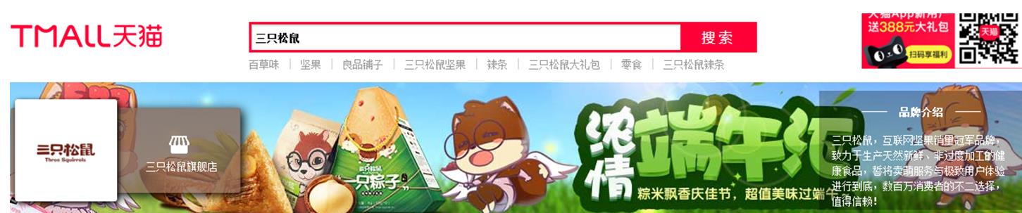 这是在天猫搜索三只松鼠出来的界面,我只截取了最上面的一部分,下面产品部分没有截取。做过钻石展位的应该都知道,这是明星店铺的一种展现(现在的明星店铺在品销宝里面,不在钻石展位了哈)