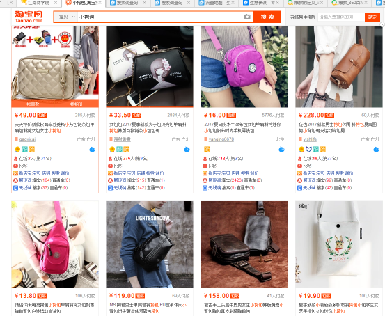 我们知道能够描述一个产品的核心词有很多,举个例子。上图宝贝我们能想到什么词来描述它?单肩包?小挎包?小圆包?这些都是他的核心词吗?现在我们去将他们放入搜索框去搜索。