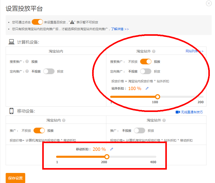 2、投放平台设置:计算机设备的淘宝站外折和移动设备的移动折扣,是否有设置出价高于100%的现象
