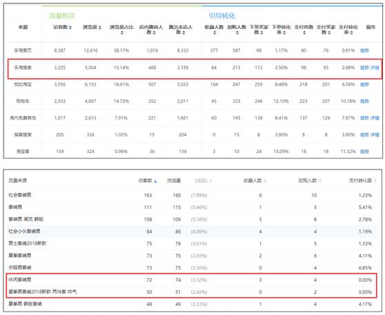 尤其是搜索进店流量和直通车进店流量,这种不精准会直接导致转化率下滑,并且伴随的还有页面停留时间短、跳失率高等表现。并且这种不精准,主要是进店关键词不精准,你可以在生意参谋——商品——商品分析——单品分析中进行分析,看最近30天的无线端数据,在手淘搜索那一项,点击“详情”,可以看一下进店关键词的表现